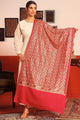 Magenta and gold-toned floral embroidered woollen shawl has a fringed border