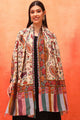 Cream-coloured and pink, mustard paisley embroidered woollen shawl has a fringed border