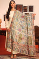 White, pink and blue paisley embroidered woollen shawl has a fringed border