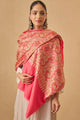 Pink and gold-toned paisley embroidered woollen shawl has a fringed border