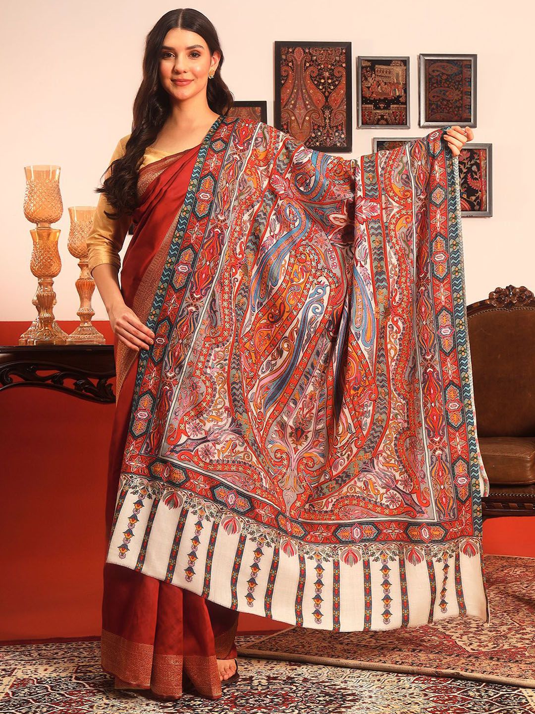 White and red paisley embroidered woollen shawl has a printed border