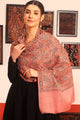 Pink and black paisley embroidered woollen shawl has a fringed border