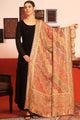Beige, green and pink paisley woven design woollen shawl has a fringed border