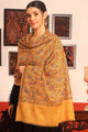 Mustard and pink paisley embroidered woollen shawl has a fringed border