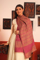 Magenta and gold-toned striped woven design shawl, has a fringed border