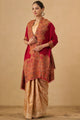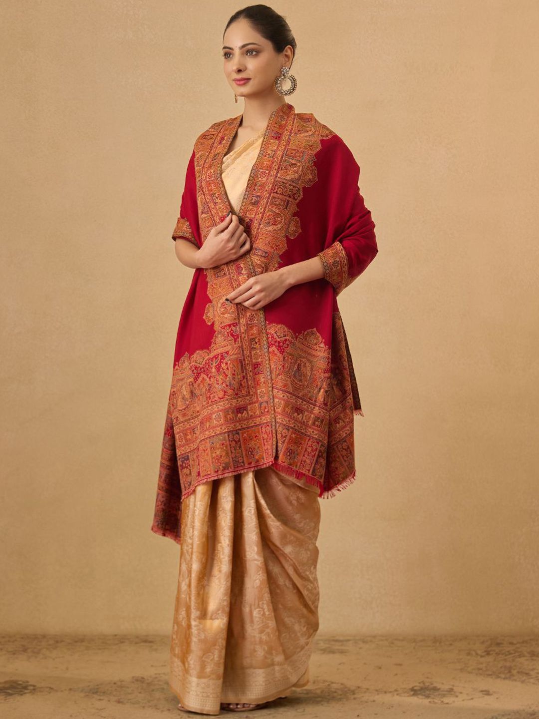 Maroon and beige tribal woven design woollen shawl has a fringed border