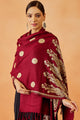 Burgundy and cream-coloured ethnic motifs embroidered viscose rayon shawl has a tasselled border