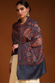 Navy blue and red ethnic motifs embroidered woollen shawl has a printed border
