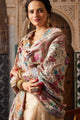 White and pink floral embroidered woollen shawl has a embroidered border