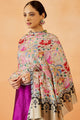 Beige and pink floral embroidered woollen shawl has a embroidered border