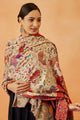 Beige and red floral embroidered woollen shawl has a embroidered border