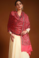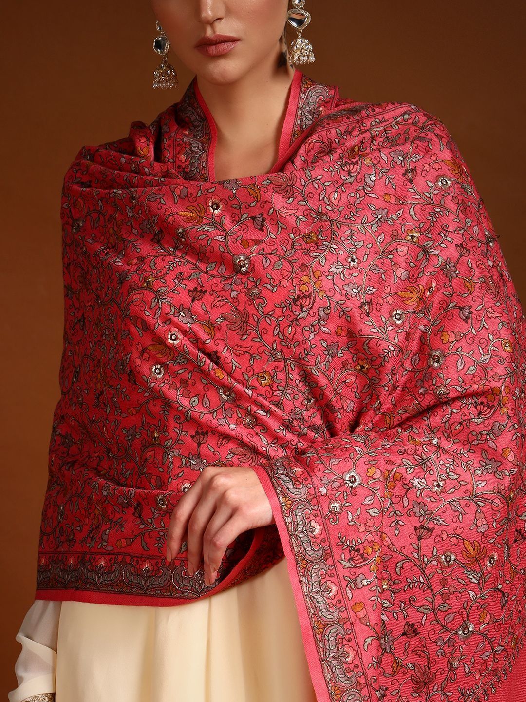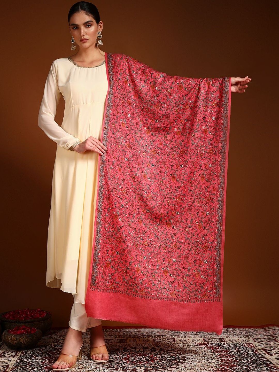 Drape this Pashmoda shawl elegantly over your shoulders, showcasing its intricate motifs. Pair with a monochrome outfit to emphasize the embroidery, or belt it at the waist for a modern twist. This timeless piece complements both traditional attire and casual ensembles, adding an artful touch to any look.
