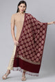 Maroon paisley and floral embroidered shawl has fringes along the borders