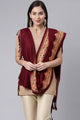 Maroon paisley and floral embroidered shawl has fringes along the borders