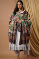 Multicolor kalamkari printed woollen shawl has hand embroidery pattern on the print