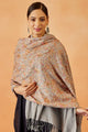 Grey and brown paisley embroidered woollen shawl has a tasselled border