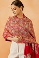 Maroon and red paisley embroidered woollen shawl has a tasselled border
