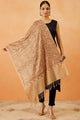 Beige paisley embroidered woollen shawl has a tasselled border
