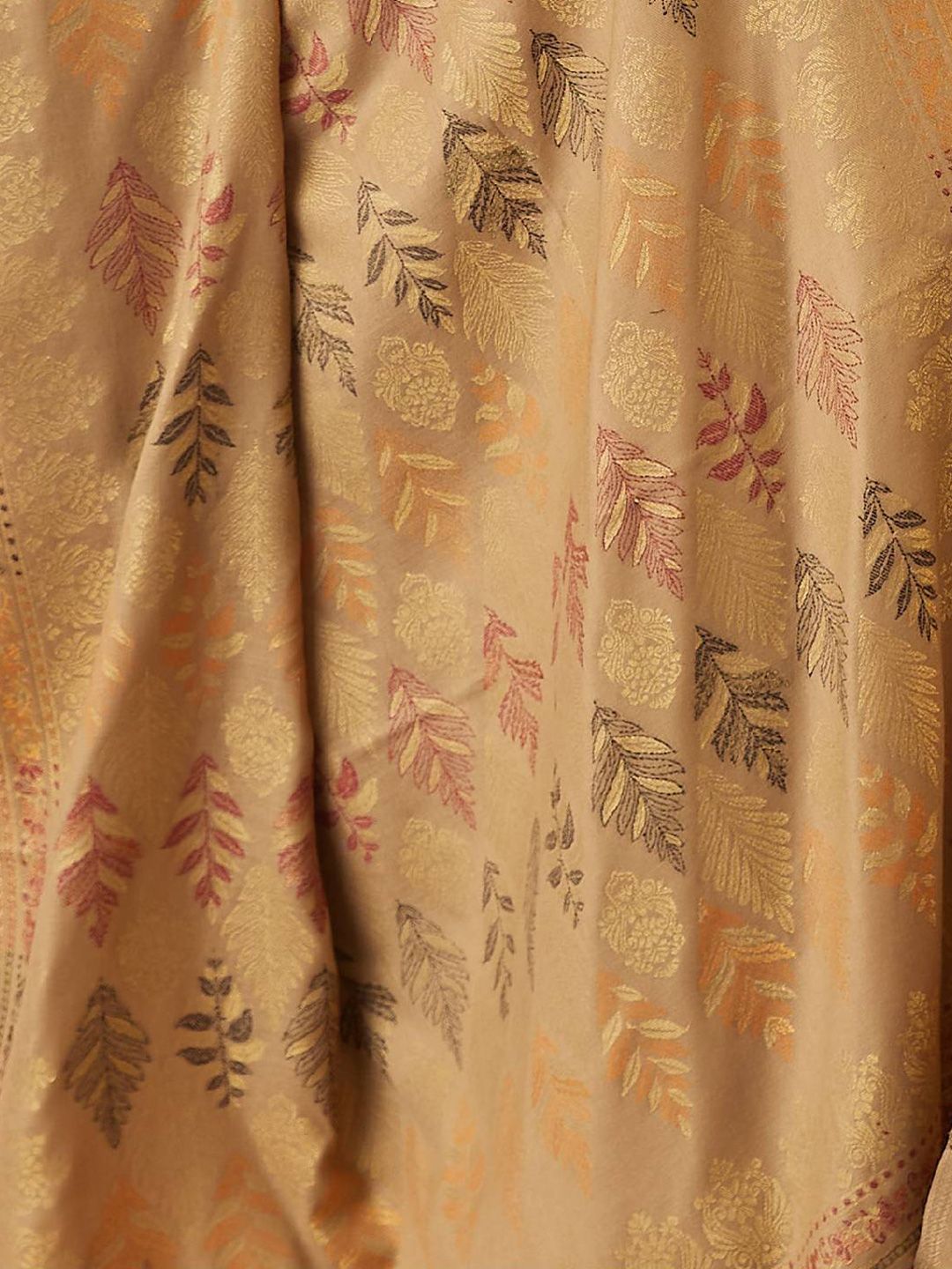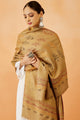 Beige and brown paisley woven design woollen shawl has a fringed border
