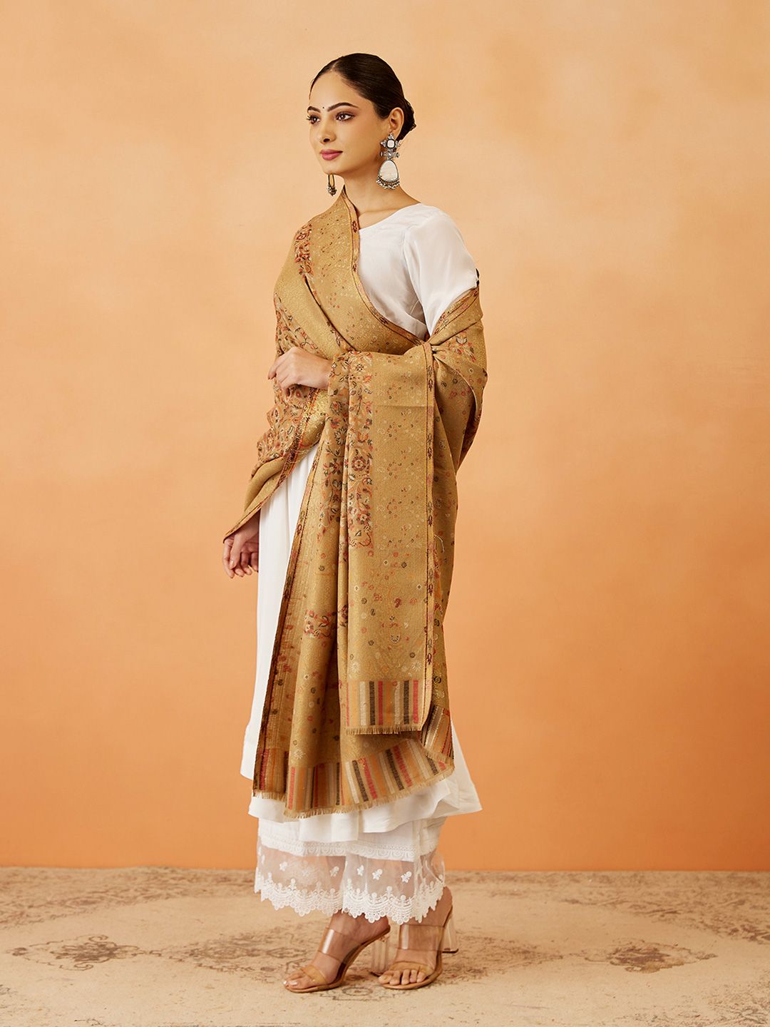 Beige and brown paisley woven design woollen shawl has a fringed border