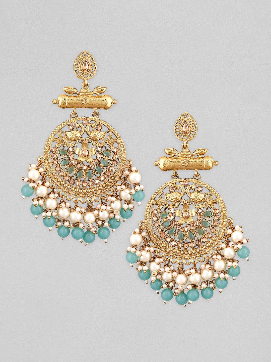 Dhiyona RJ 18K Antique Gold-Plated Big Chandbali with Pearl & Turquoise Blue Bead Accents