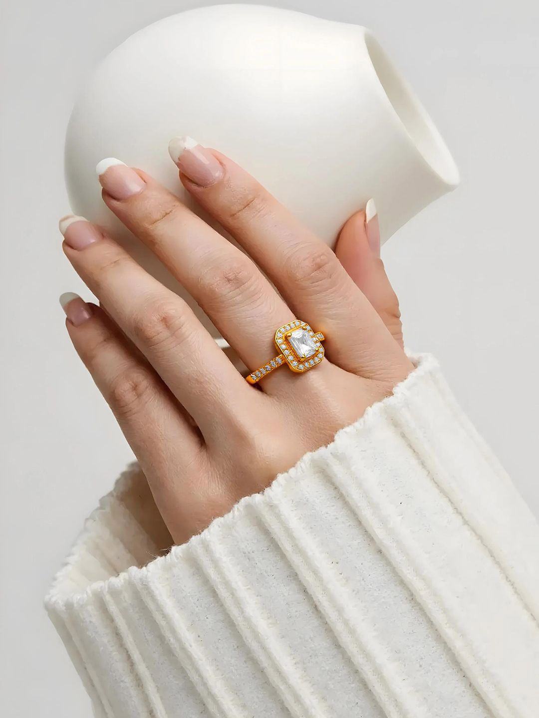 Dhiyona RJ 18K Gold-Plated Adjustable White Cubic Zirconia Studded Rectangular Halo Ring