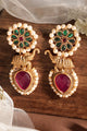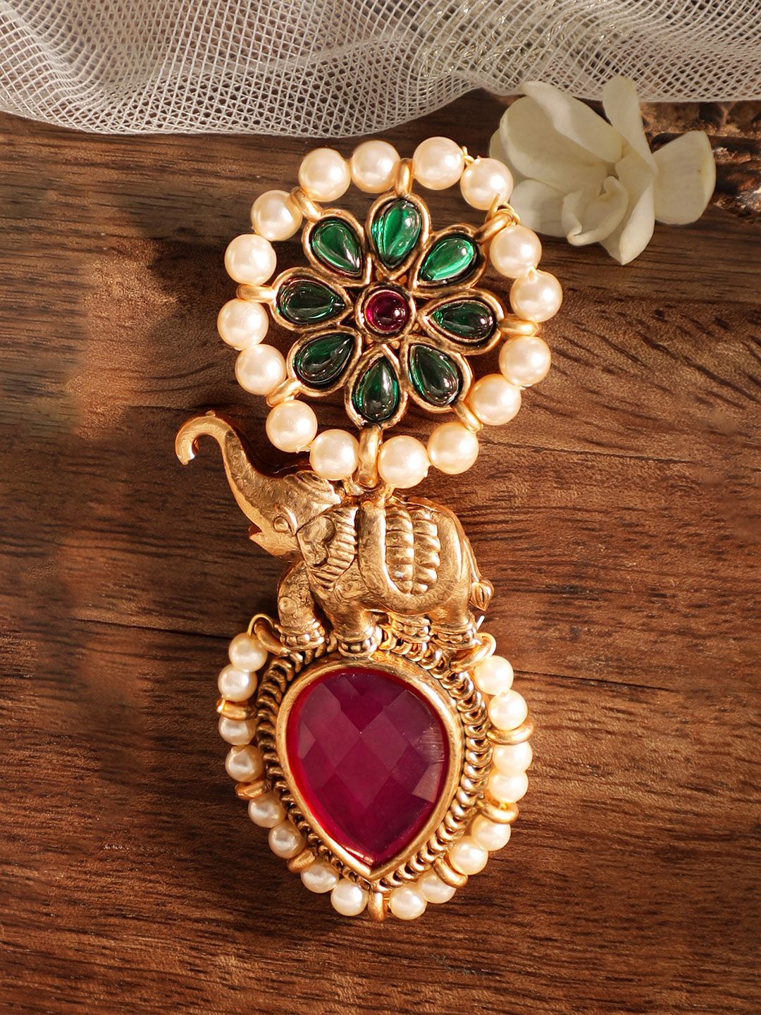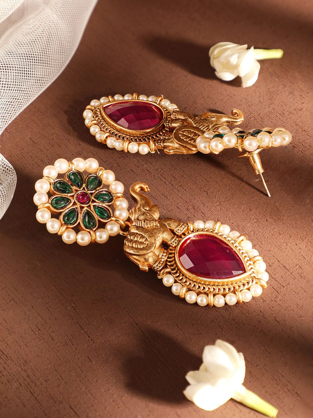 Dhiyona RJ 18K Gold-Plated Red & Green Stone Studded Elephant Motif Earring with Pearl Accents