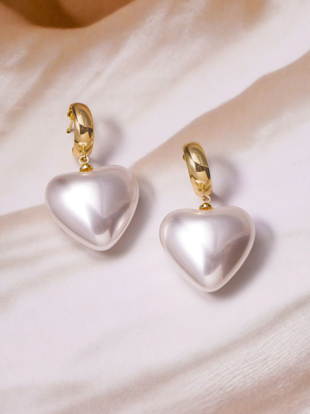 Gold-toned, white heart shaped drop earrings, 18KT gold-plated, has pearls