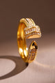 22k Gold-plated criss-cross shaped adjustable finger ring, has white american diamond stone-studded details