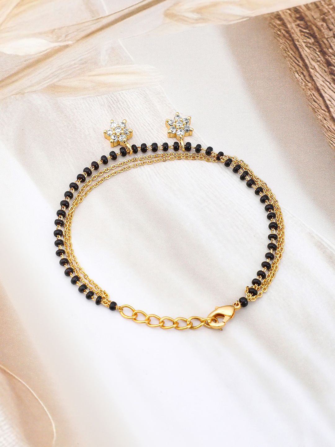 Dhiyona RJ 18K Gold-Plated Zirconia Drops with Black & Gold Beaded Mangalsutra Bracelet