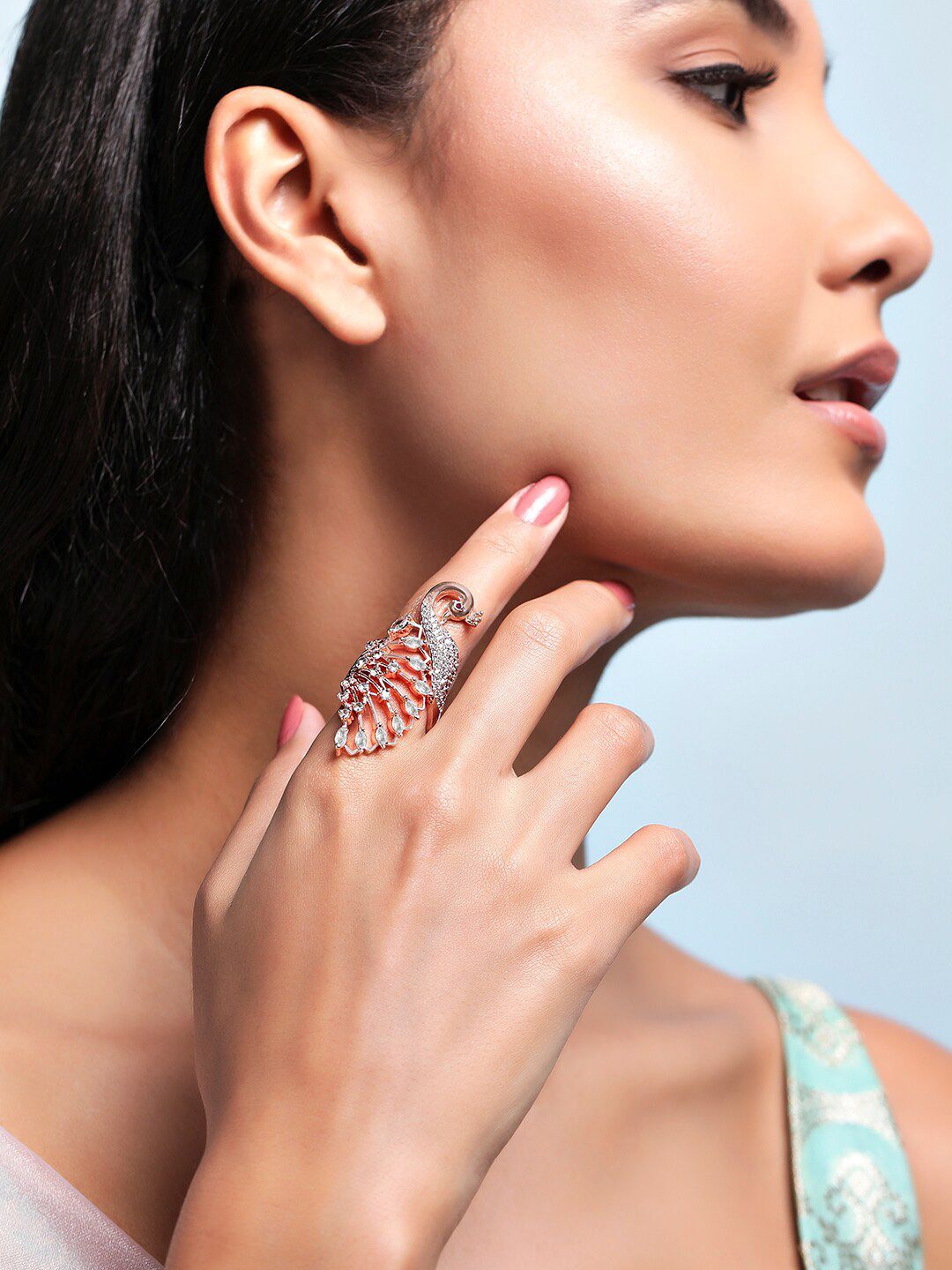 Dhiyona RJ 18K Rose Gold-Plated Peacock Design Cubic Zirconia Studded Finger Ring