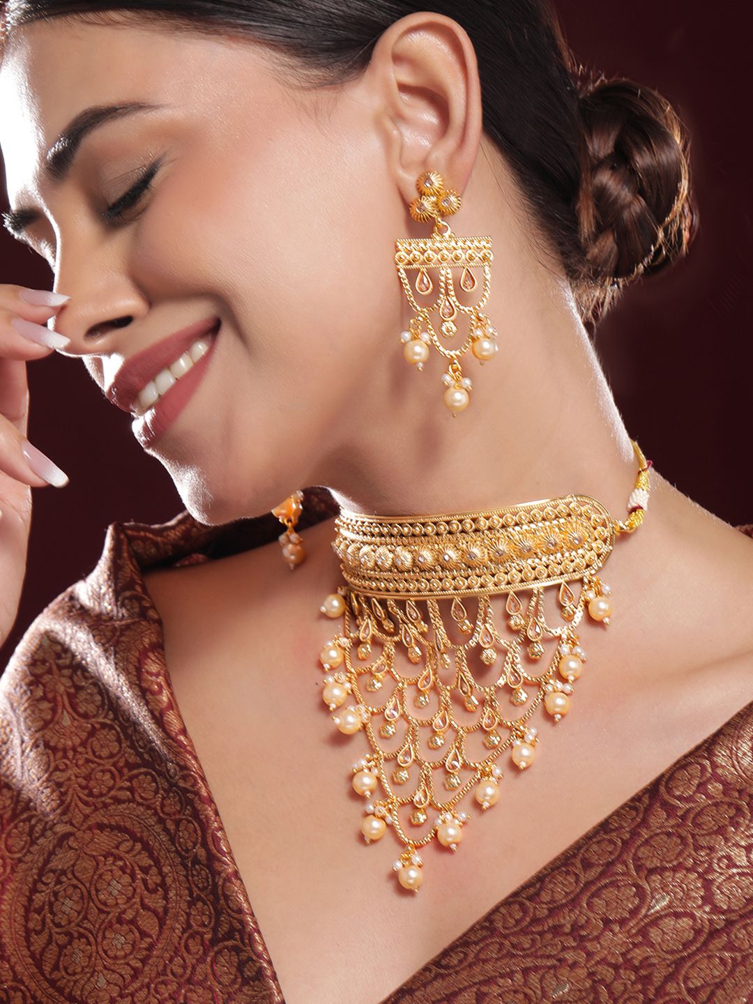 Dhiyona RJ 22K Gold-Plated Choker Necklace Set With Pearls & Intricate Layered Design