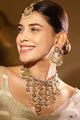 This jewellery set consists of a necklace, a pair of earrings and maang tikka