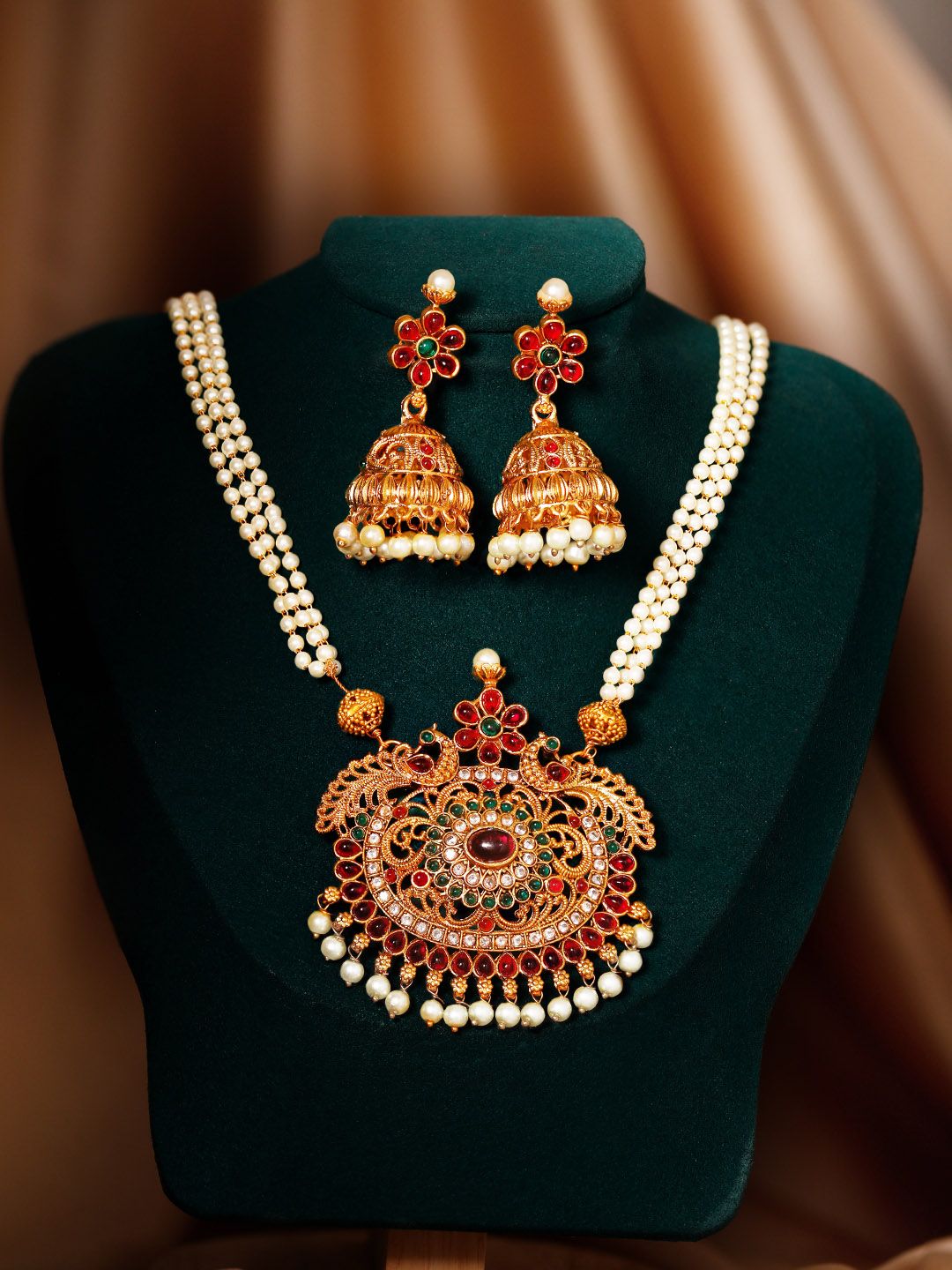 Dhiyona RJ 22K Gold Plated Ruby Emerald & Cubic Zirconia Studded Pearl Beaded Jewellery Set