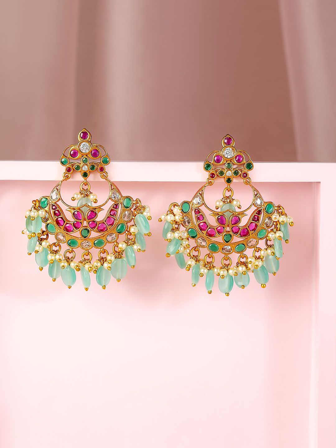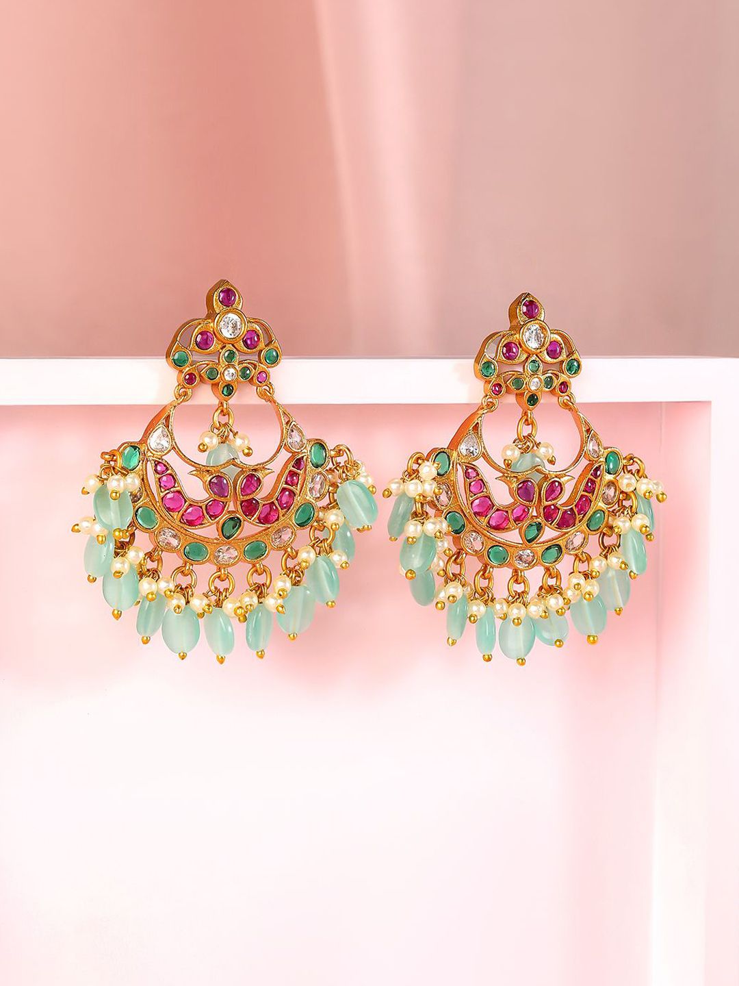 Dhiyona RJ 22K Gold-Plated Ruby & Emerald Stone Studded Mint Green Beaded Chandbali Earrings