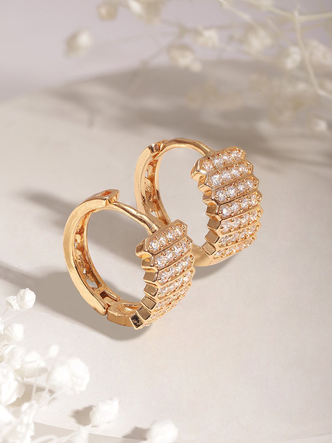 Gold-toned classic half hoop earrings, gold-plated, has american diamond studded