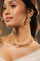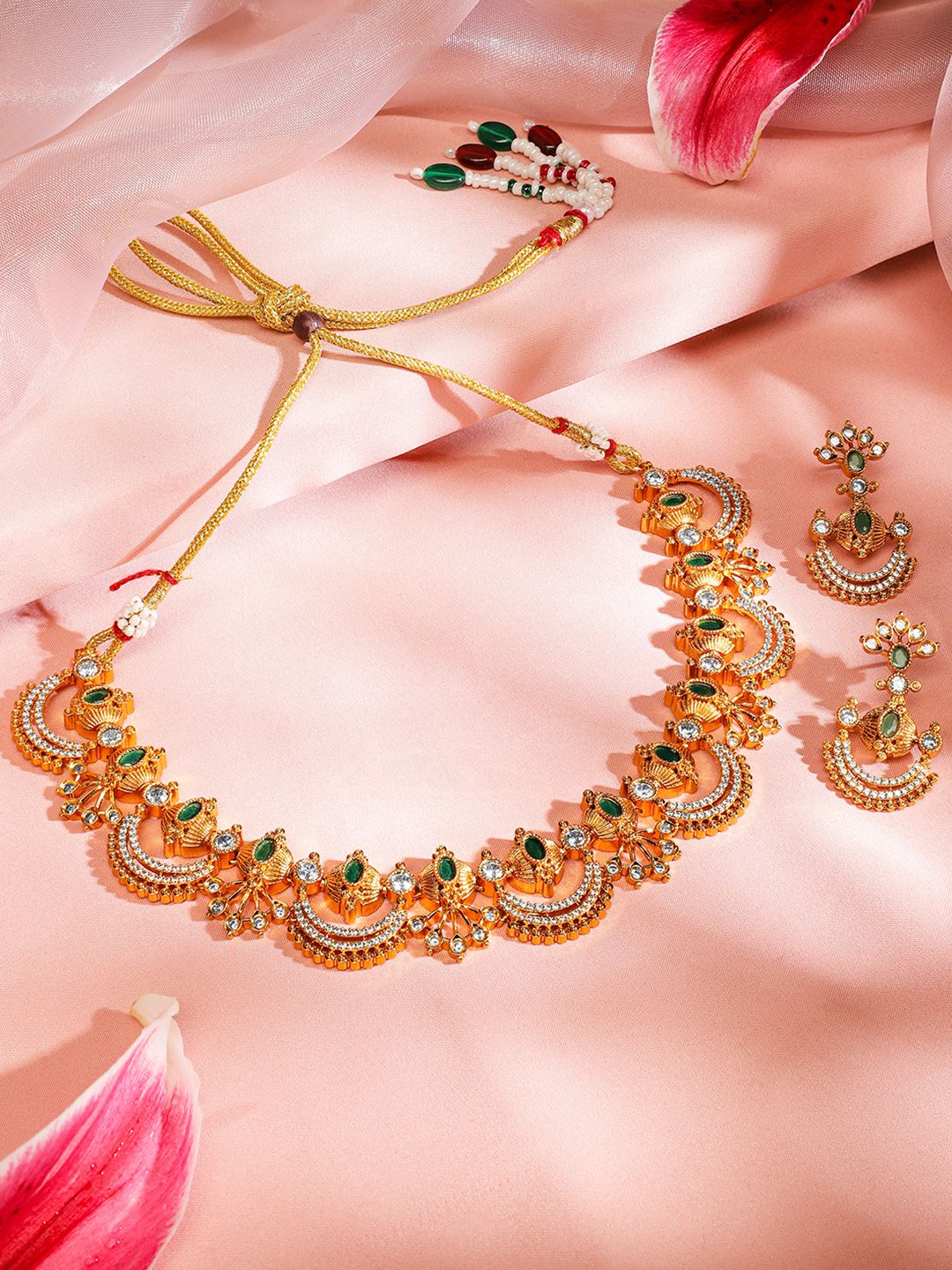24K Gold-plated choker necklace, has green and white cubic zirconiastone-studded details