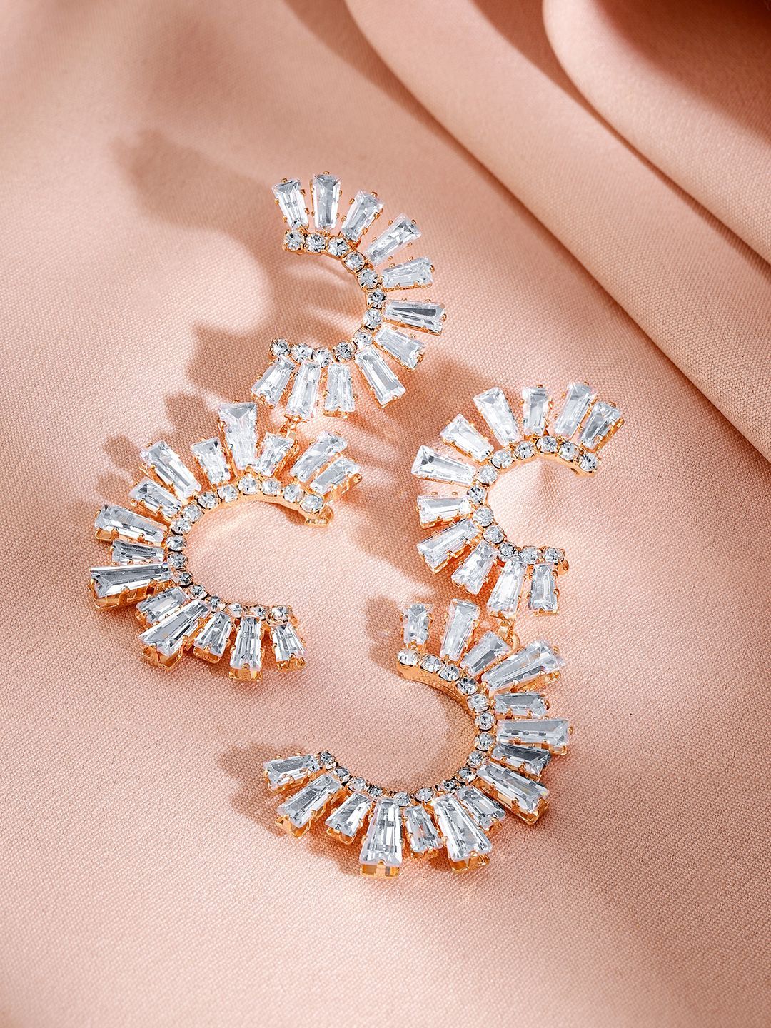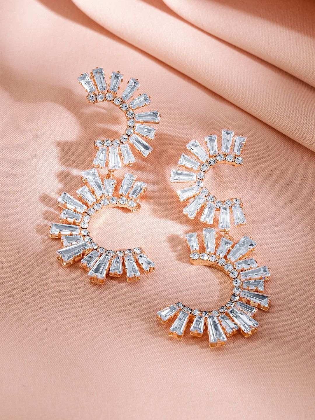 18K Gold-Plated Curved Crystal Stone Studded Contemporary Shaped Drop Earrings