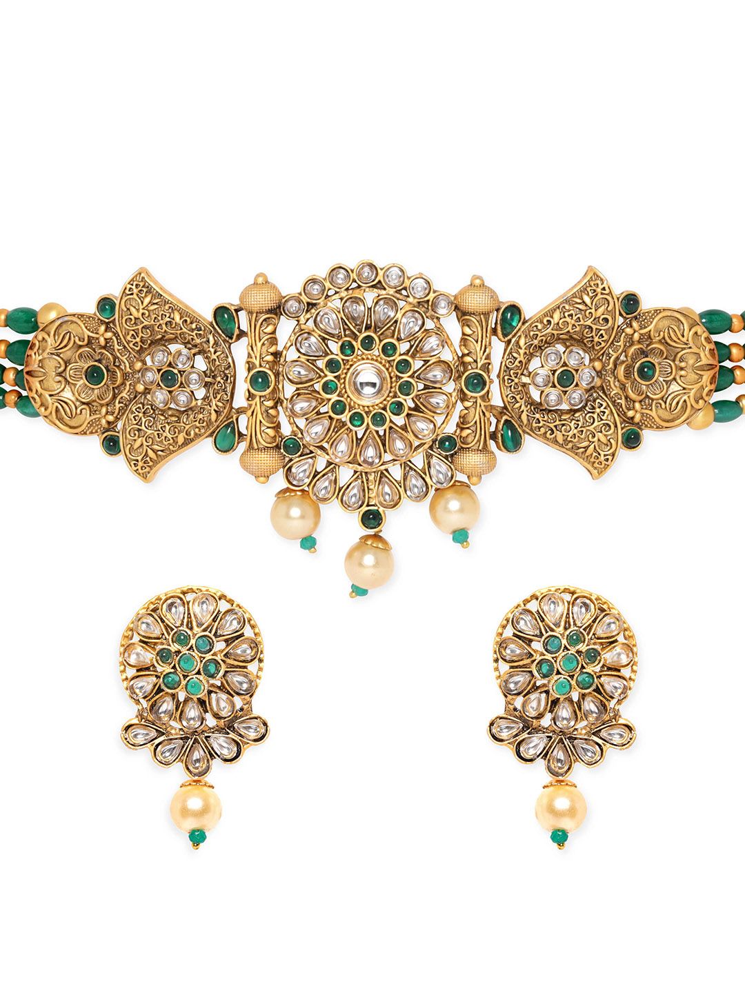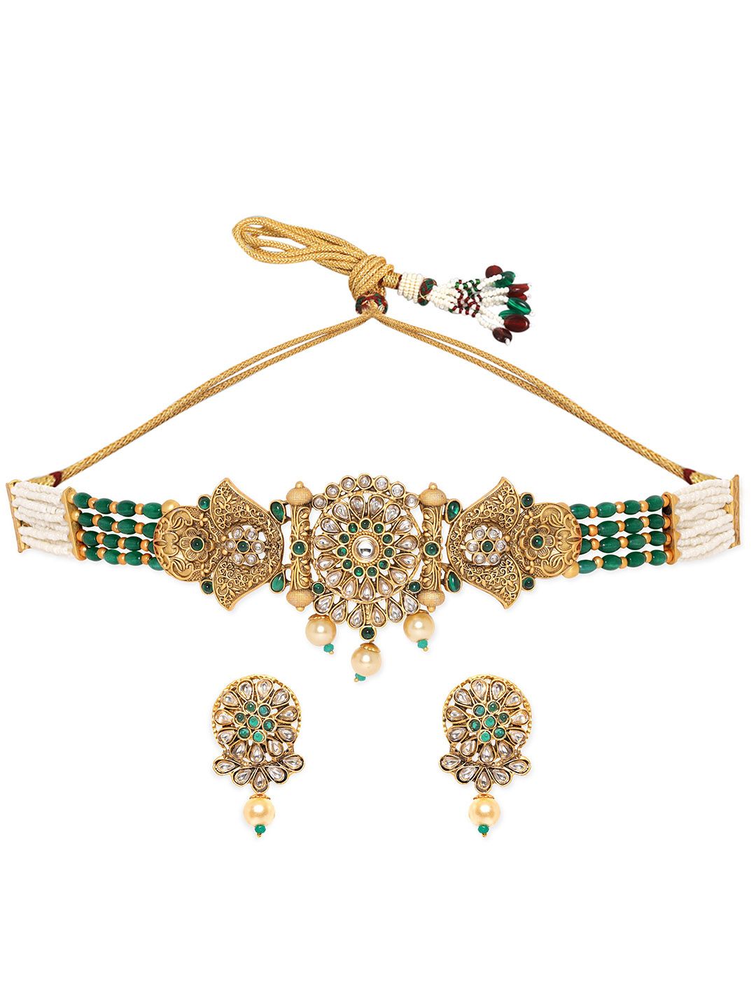 Dhiyona RJ Women's Gold-Plated Emeral & Kundan Stone-Studded & Pearl Beaded Choker Jewellery Set
