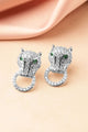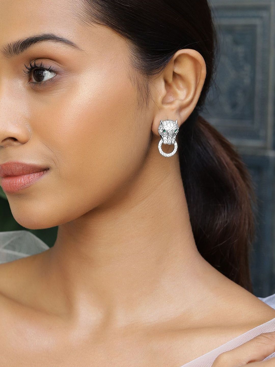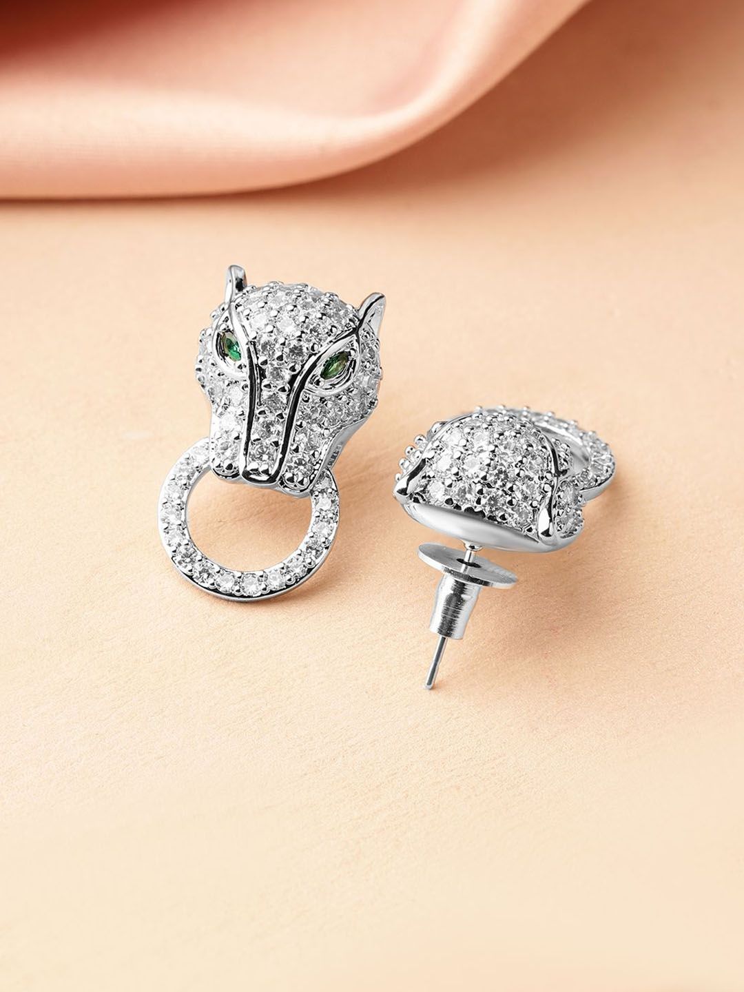 Dhiyona RJ Rhodium-Plated Cubic Zirconia Panther Design Stud Earrings with Emerald Accents