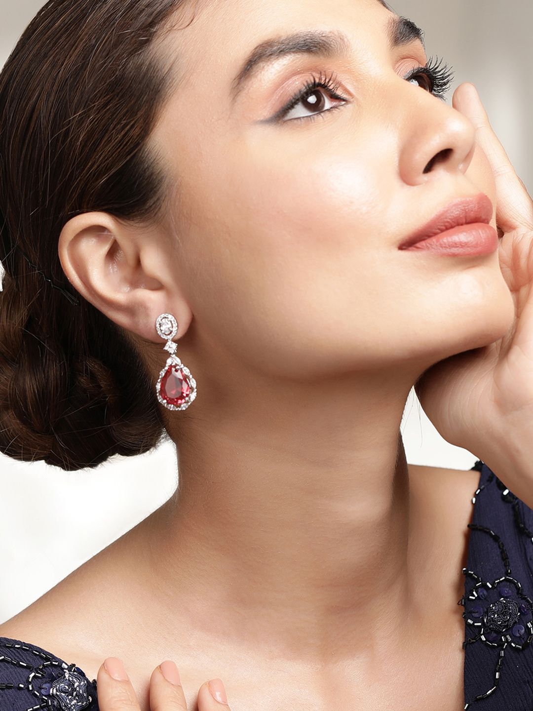 Dhiyona RJ Women's Rhodium Plated Ruby Studded Zirconia Teardrop Earring