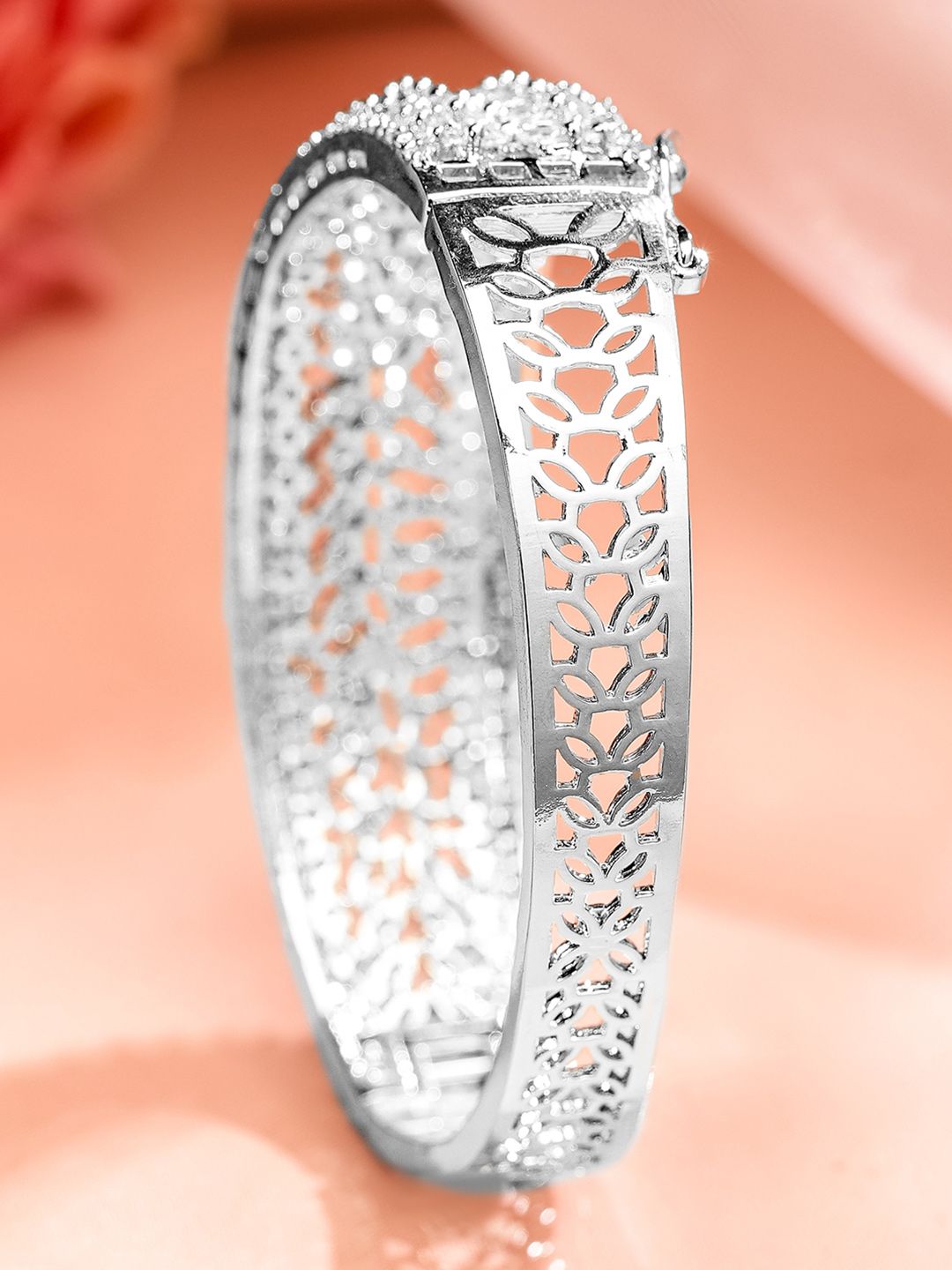 Dhiyona RJ Rhodium-Plated White Cubic Zirconia Studded Openable Bracelet with Classic Design