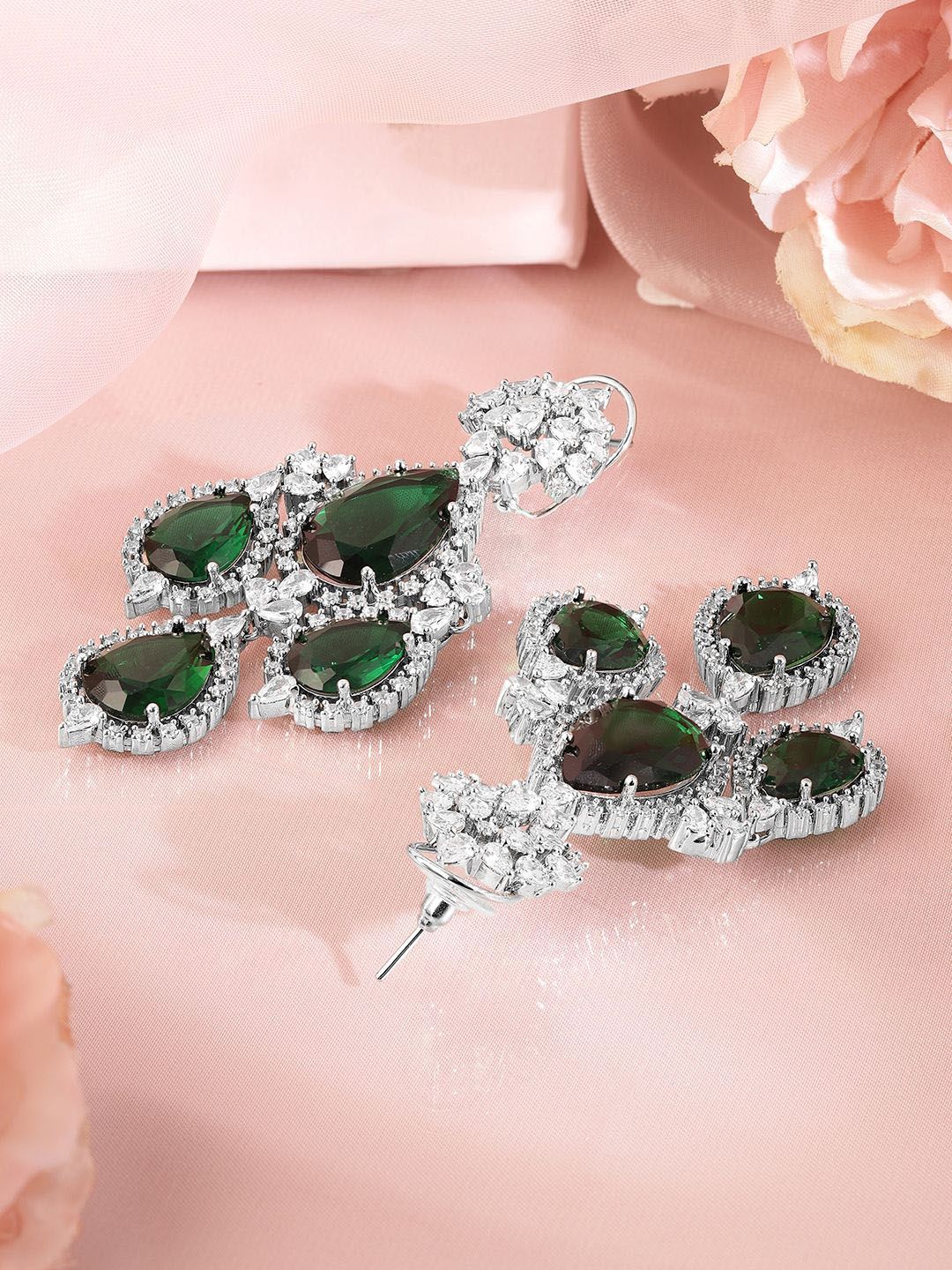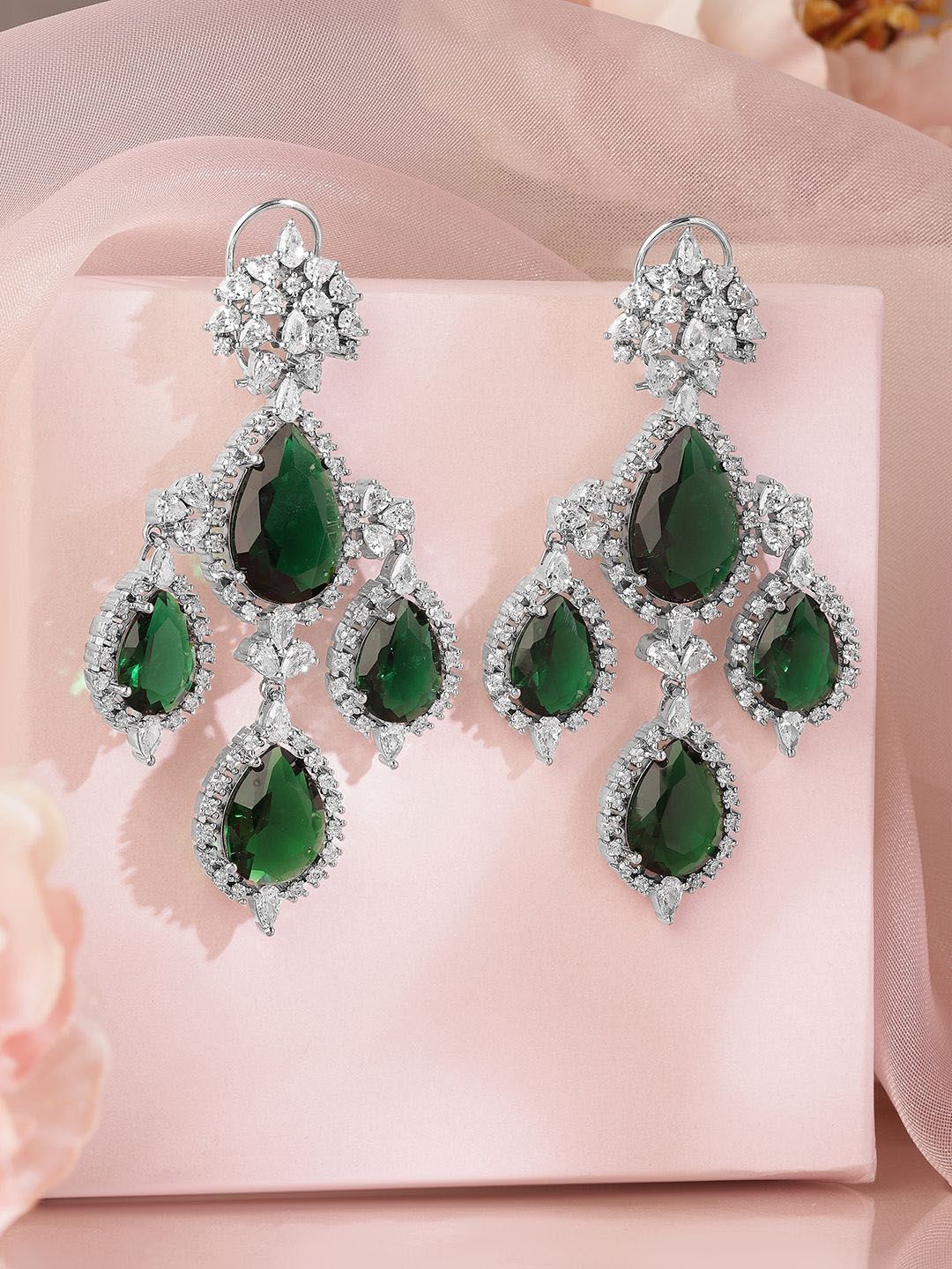 Dhiyona RJ Silver-Plated Emerald Green & Cubic Zirconia Studded Premium Chandelier Earrings
