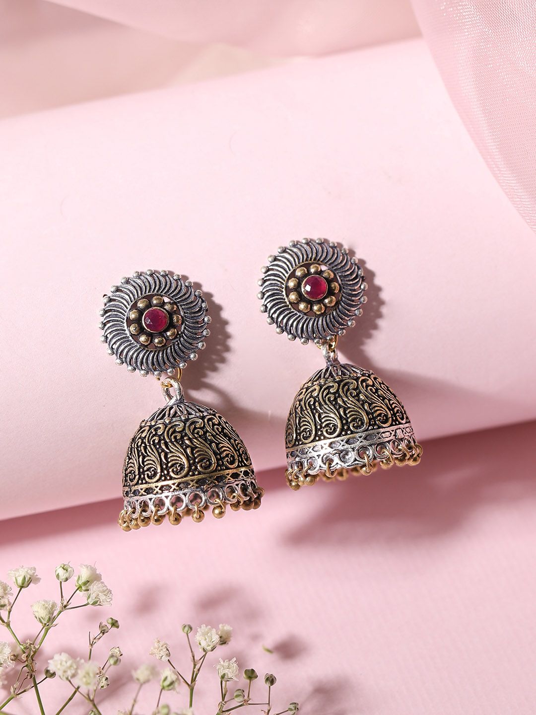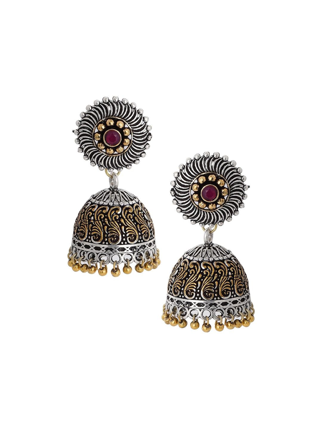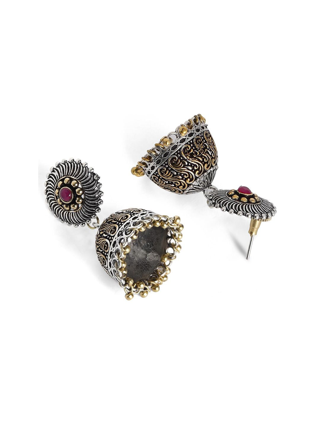 Dhiyona RJ Women's Silver-Plated & Gold-Toned Handcrafted Oxidised Dome Shaped Jhumkas