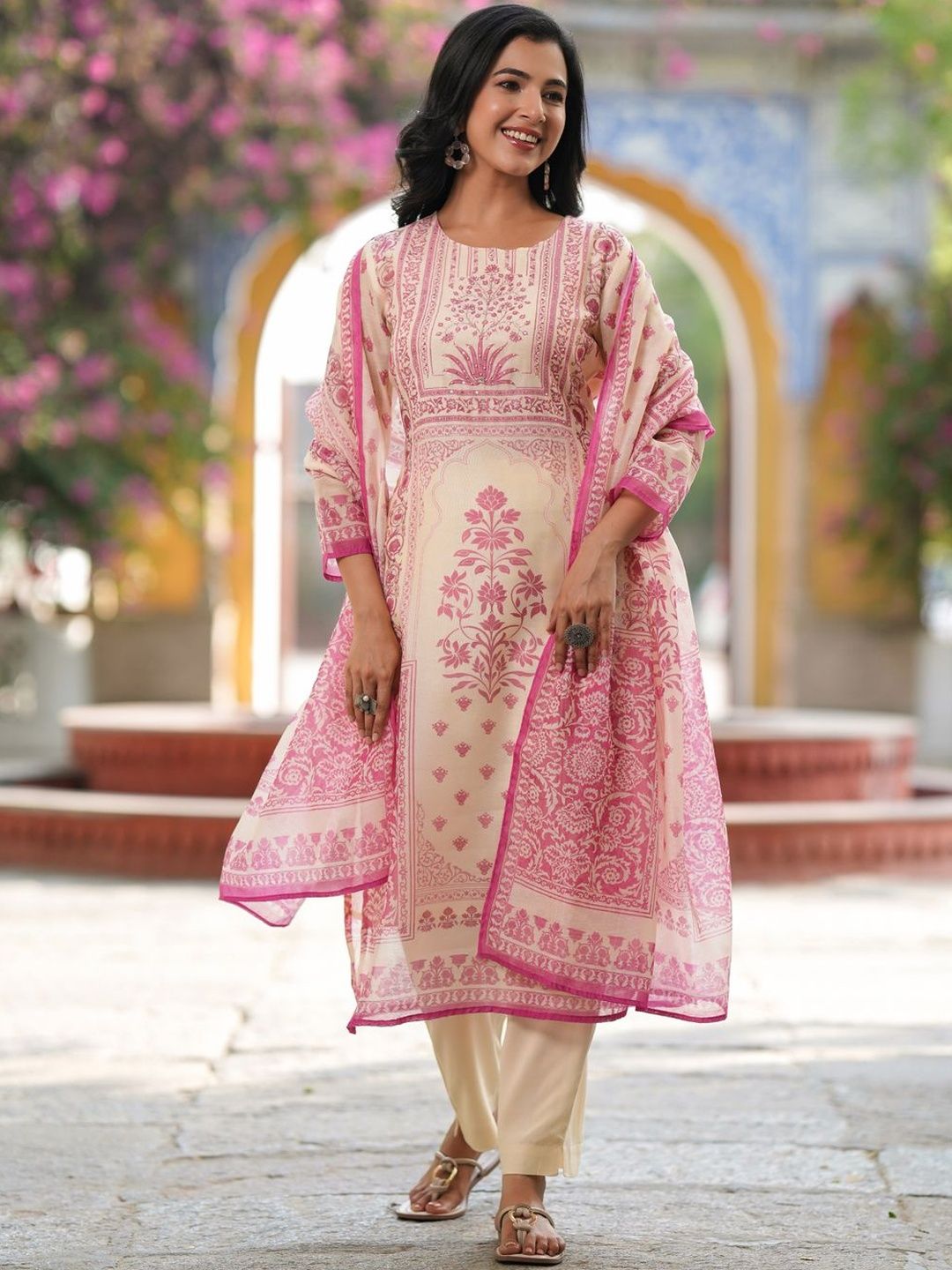 Cream & Pink Printed Kurta with Trousers & Dupatta