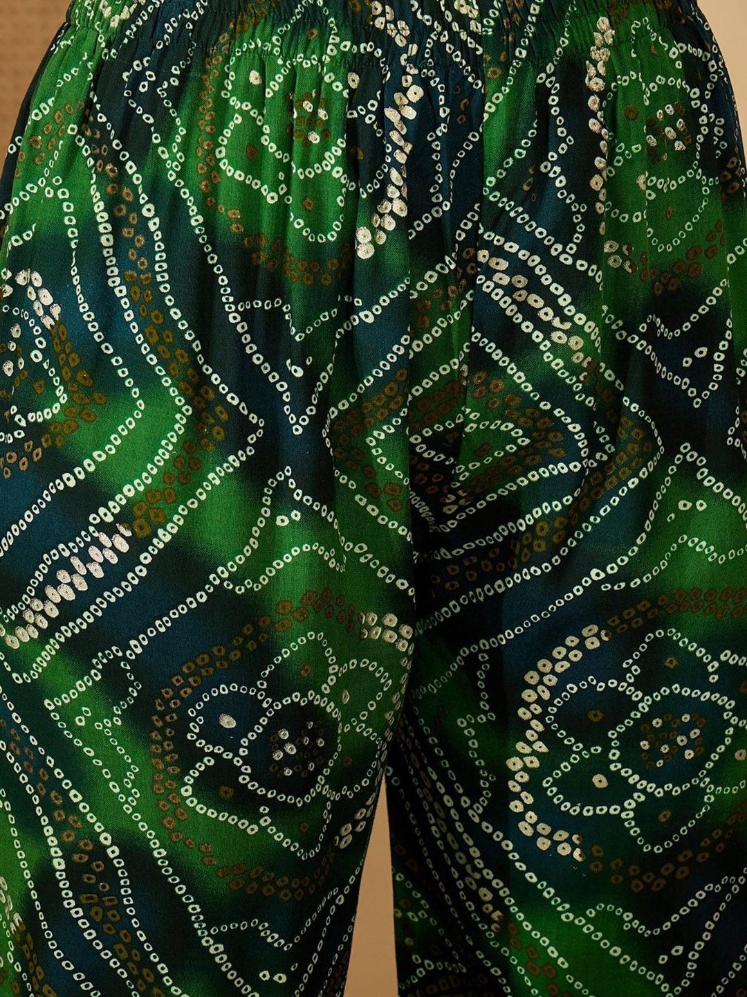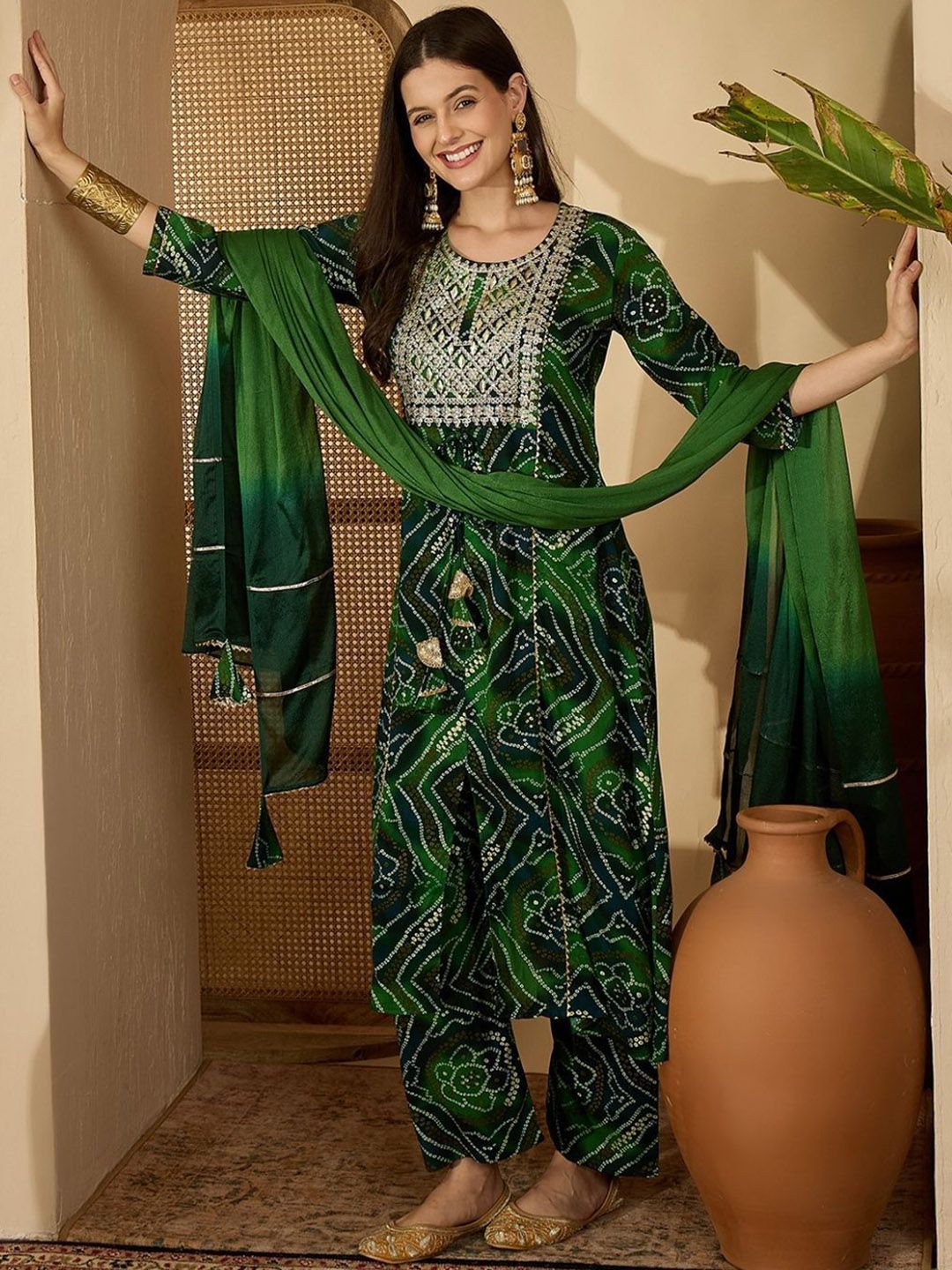 Dhiyona SN Women's Bandhani Printed Round Neck Sequinned A-Line Kurta And Trousers With Dupatta