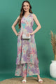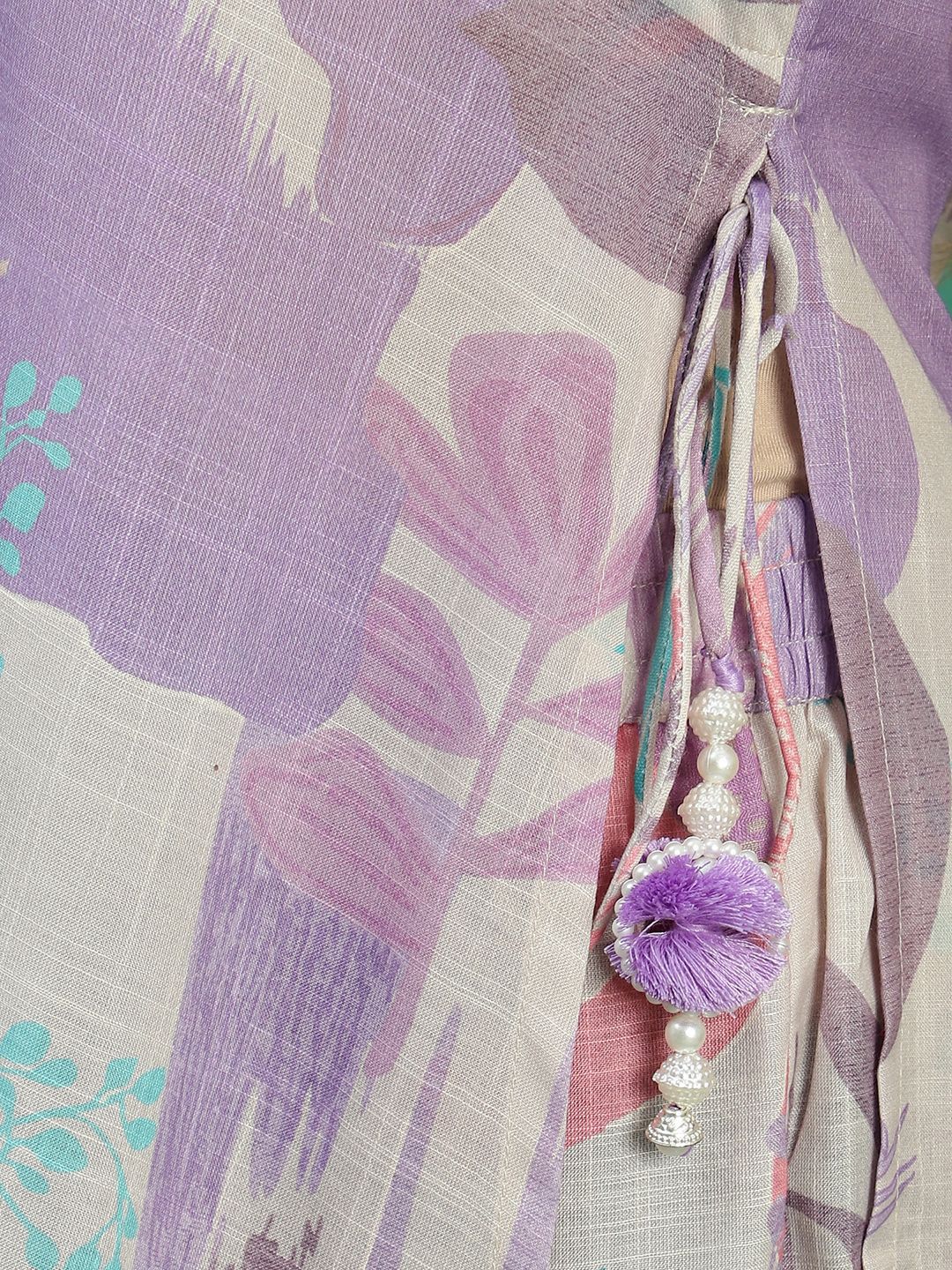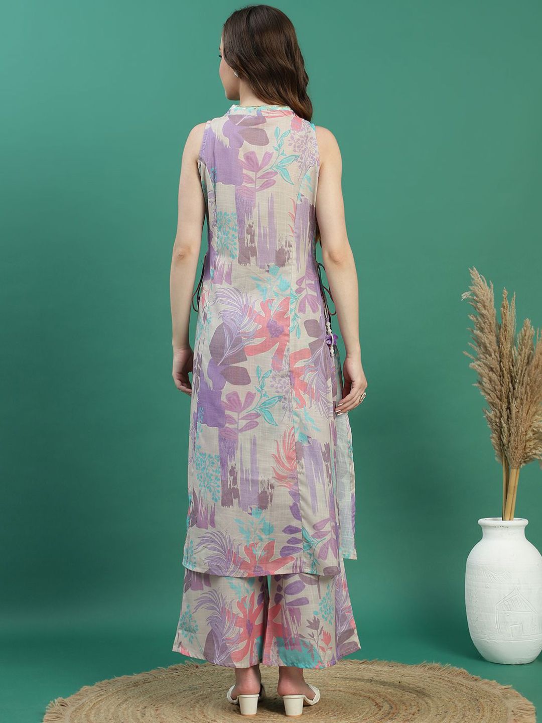 Dhiyona SN Women's Beige Floral Printed Mirror Work V-Neck Straight Kurta With Trousers