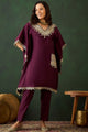 Dhiyona SN Women's Burgundy Geometric Embroidered V-Neck Mirror Work Kaftan With Trousers
