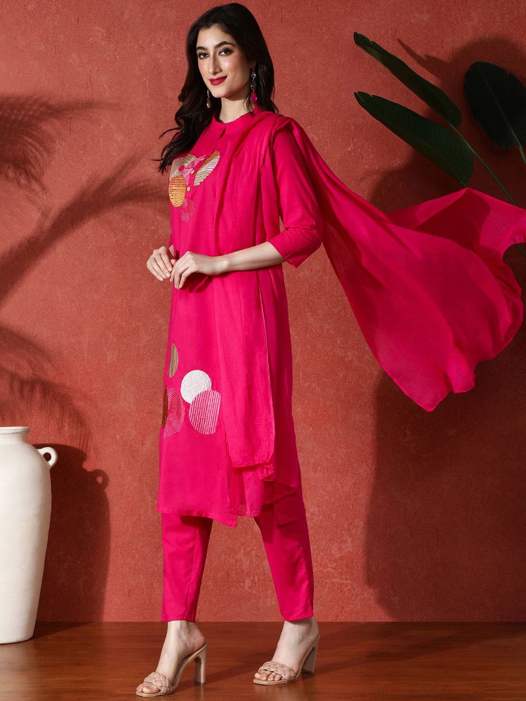 This kurta set consists of kurta, trousers and dupatta
