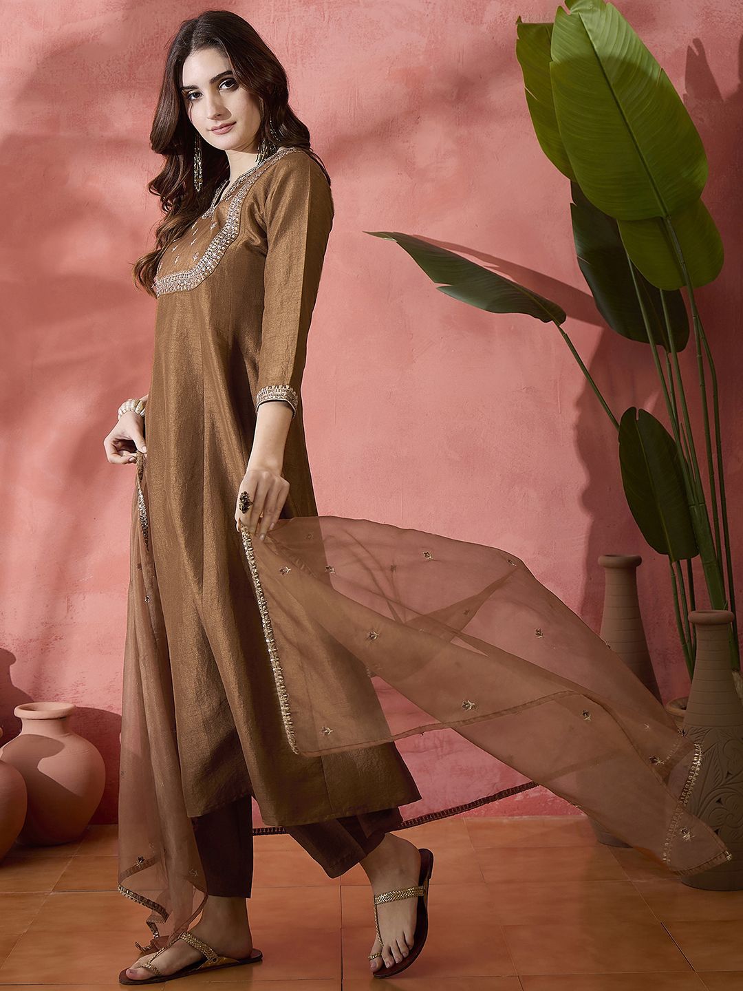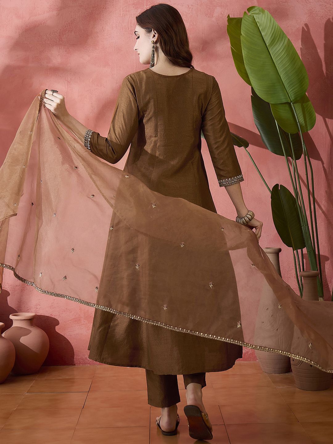 Dhiyona SN Women's Floral Embroidered Sequinned A-Line Kurta With Trousers & Dupatta